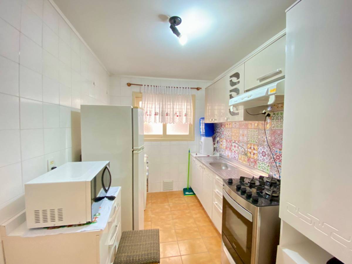À UMA QUADRA DO MAR! Edifício com elevador, , fachada 100% revestida, luz por presença, hall de entrada em porcelanato. Apartamento de 1 dormitório, mobiliado e decorado, peças amplas e separadas, sala, cozinha, banheiro, churrasqueira, sacada lateral, orientação solar leste/norte, 55m². Aceita financiamento bancário.