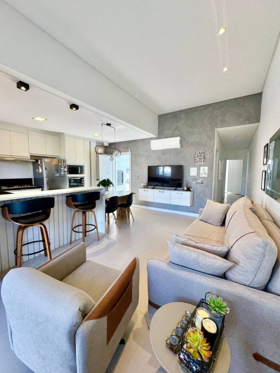 CASA EM XANGRI-LÁ – LADO MAR Casa com 2 dormitórios, sendo 1 suíte, e banho social. Cozinha e living integrados com móveis sob medida, proporcionando ambientes funcionais e aconchegantes. Conta com área de serviço com churrasqueira e teto retrátil, 73 m² privativos, laje e acabamento em gesso. Possui placas solares, água quente, poço artesiano e piscina aquecida. Pode ser financiada, oferecendo conforto, praticidade e excelente localização próximo ao mar.
