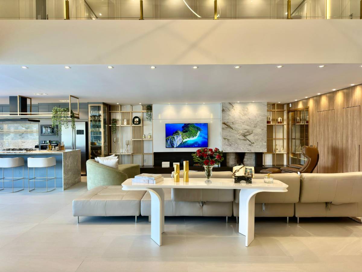 Sobrado Luxuoso Arquitetura contemporânea 05 suítes, sendo 02 master Amplo living com pé direito duplo integrando a sala de estar e jantar Espaço gourmet composto com churrasqueira a carvão e forno de pizza a lenha Mobiliada Decorada Piscina de concreto, ofurô e praia infantil