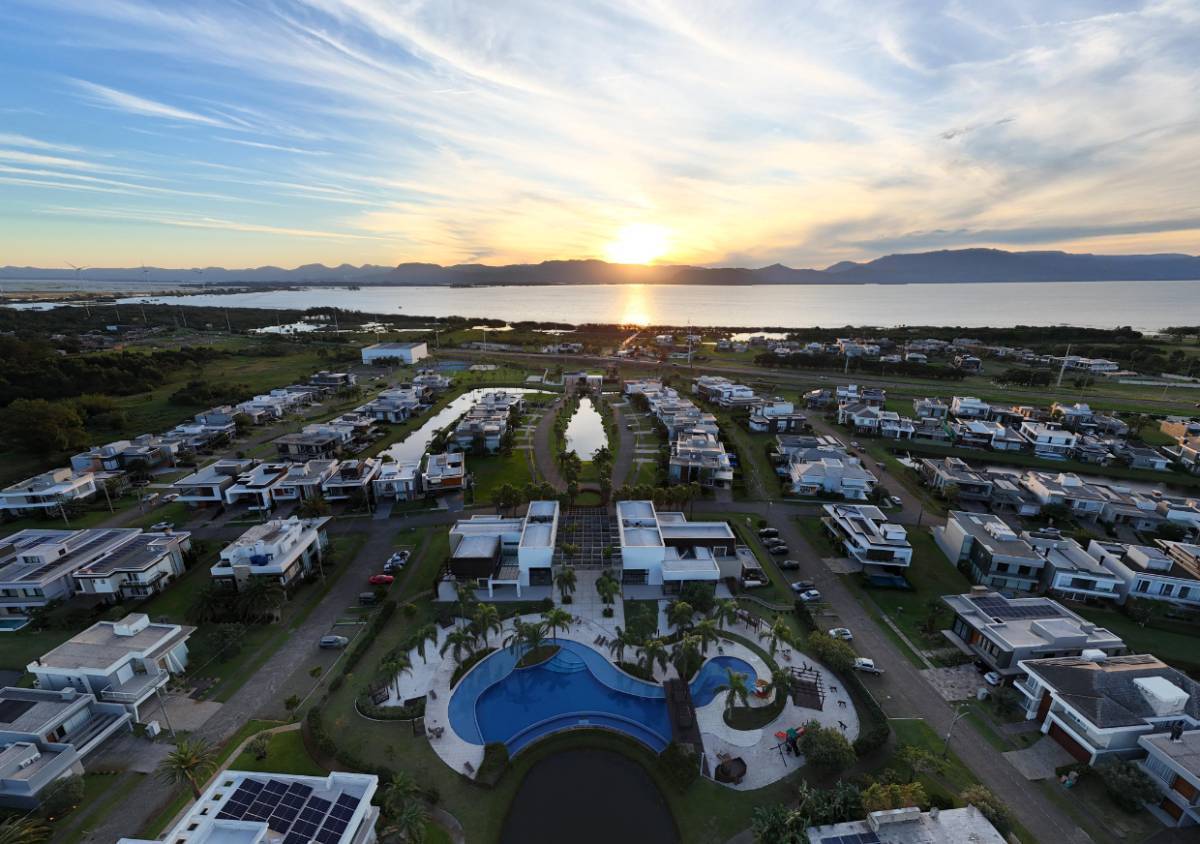 Casa de Luxo Beira Lago no Condomínio Capão Ilhas Resort Esta residência de alto padrão em Capão da Canoa oferece uma experiência sofisticada de moradia à beira do lago. Com 350 metros quadrados de área privativa, o imóvel é entregue totalmente mobiliado, decorado e equipado com sistema de automação nos ambientes. A estrutura conta com quatro suítes, sendo uma master com closet e banheira de hidromassagem, além de uma sala de cinema privativa. O living é amplo e possui lareira, integrando-se à cozinha americana e ao espaço gourmet com churrasqueira. A área externa dispõe de piscina de concreto com vista privilegiada para o lago, enquanto a parte funcional inclui lavabo, lavanderia e duas vagas de garagem cobertas. O imóvel une conforto e tecnologia em uma das localizações mais exclusivas do litoral.