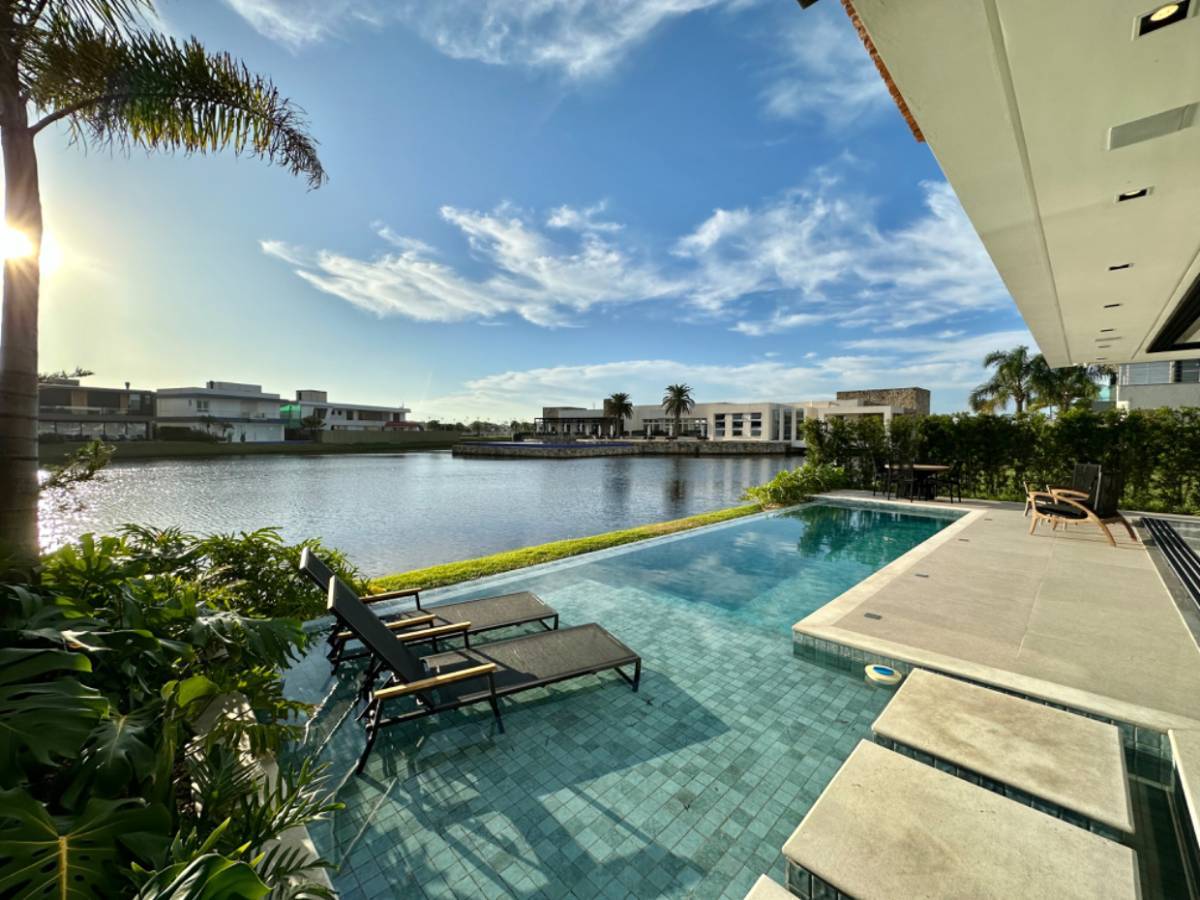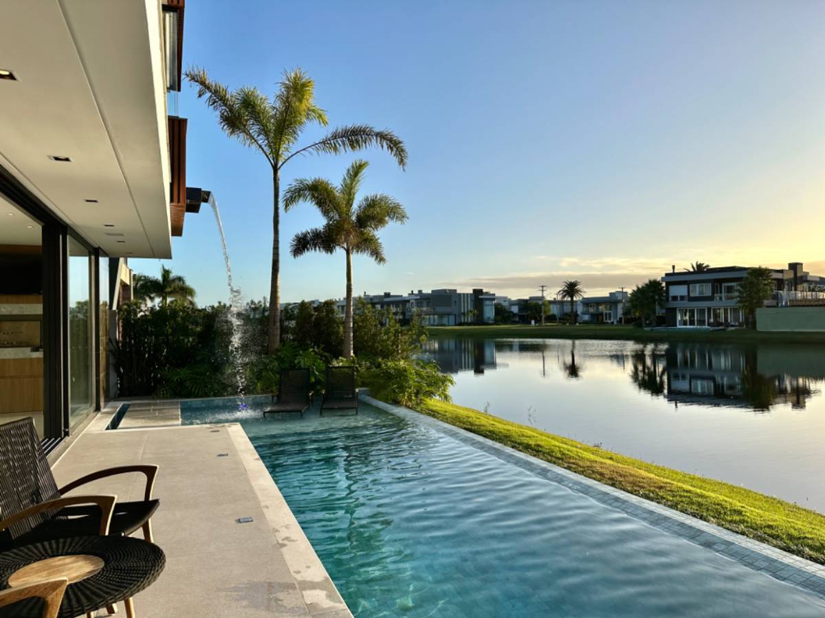 Casa térrea de alto padrão no Condomínio Enseada Sala de estar e jantar amplas e sofisticadas Cinema privativo para momentos de lazer Espaço gourmet integrado à área de lazer Piscina de concreto com borda infinita e cascata Jardim com irrigação automatizada Posição solar e localização privilegiada Abrigo para 2 carros e depósito externo fechado Mobiliada, decorada e pronta para morar