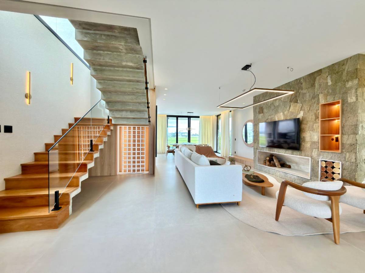 Sobrado de Alto Padrão Beira-Lago no Amare Home Resort Espetacular sobrado com 370 m² de área construída, localizado estrategicamente à beira do lago e equipado com elevador privativo. O imóvel é totalmente mobiliado, decorado com requinte e conta com 05 suítes (sendo uma master com closet).O amplo living integrado conecta-se harmonicamente à área externa, que oferece uma fachada imponente, paisagismo com iluminação e irrigação automática, além de uma belíssima piscina de concreto iluminada com deck privativo sobre o lago. Situada no Amare Home Resort, o condomínio mais completo e moderno do litoral, a residência oferece acesso a uma infraestrutura de lazer incomparável: paradouro exclusivo à beira-mar, diversas piscinas, academia, sauna, salão de beleza e espaços sociais completos. Um imóvel de altíssimo padrão construtivo, unindo luxo e sofisticação em cada detalhe